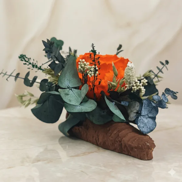 El centro de flores preservadas «Brillo» es una obra de arte natural, ideal para decorar cualquier espacio con un toque vibrante y elegante. La protagonista de este arreglo es una rosa naranja intensa, que destaca sobre una base rústica y rodeada de elementos naturales como eucalipto, espigas y detalles en tonos claros. La combinación de colores y texturas hace de este centro un elemento decorativo versátil, perfecto para el hogar, oficinas o como pieza central en eventos especiales como bodas, comuniones o bautizos.